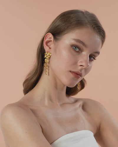 Gold toned earrings inspired by cascading blooming flowers and delicate botanical details.