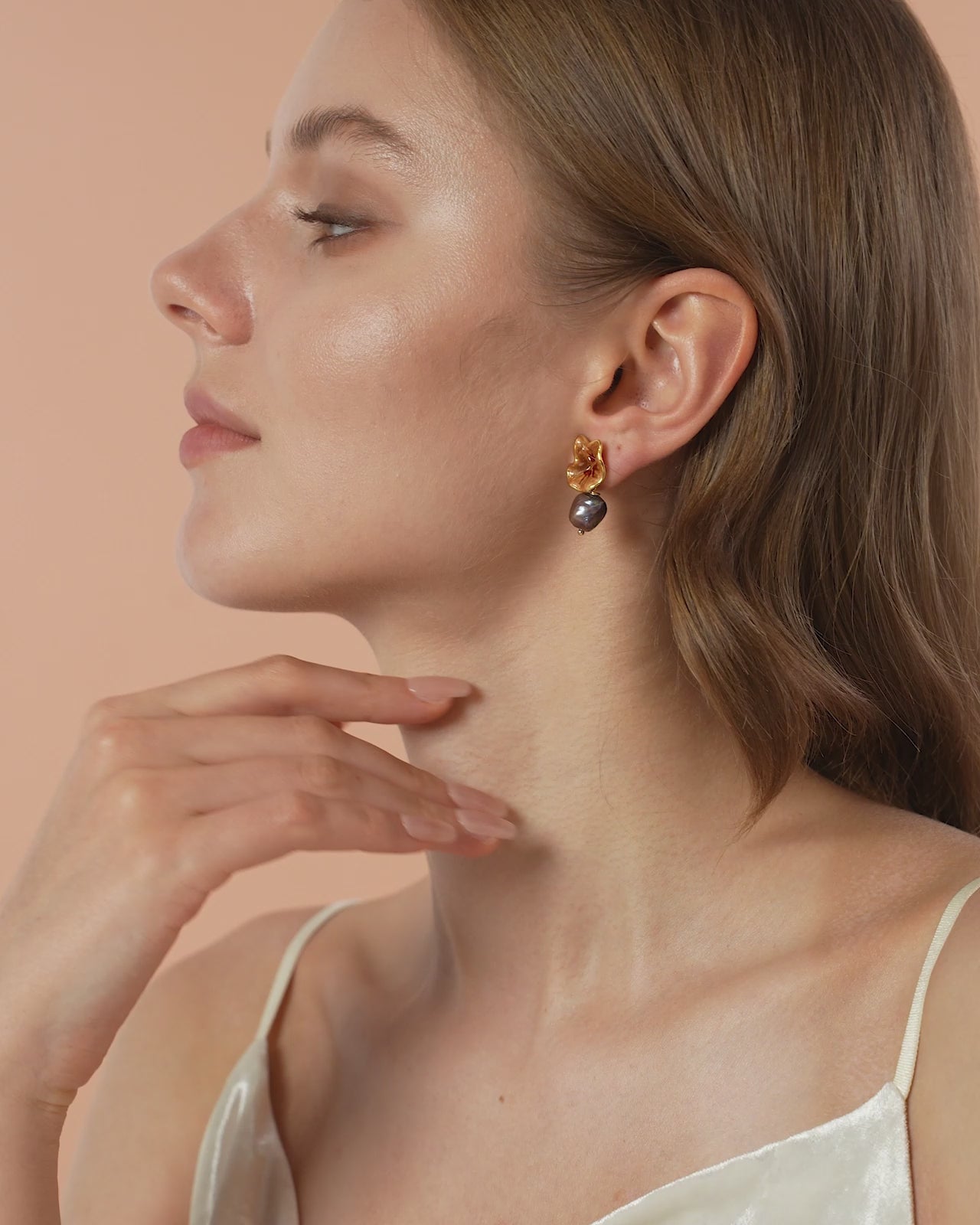 Gold toned earrings featuring an organic sculptural stud paired with luminous gray baroque pearl drops for a modern yet timeless look.