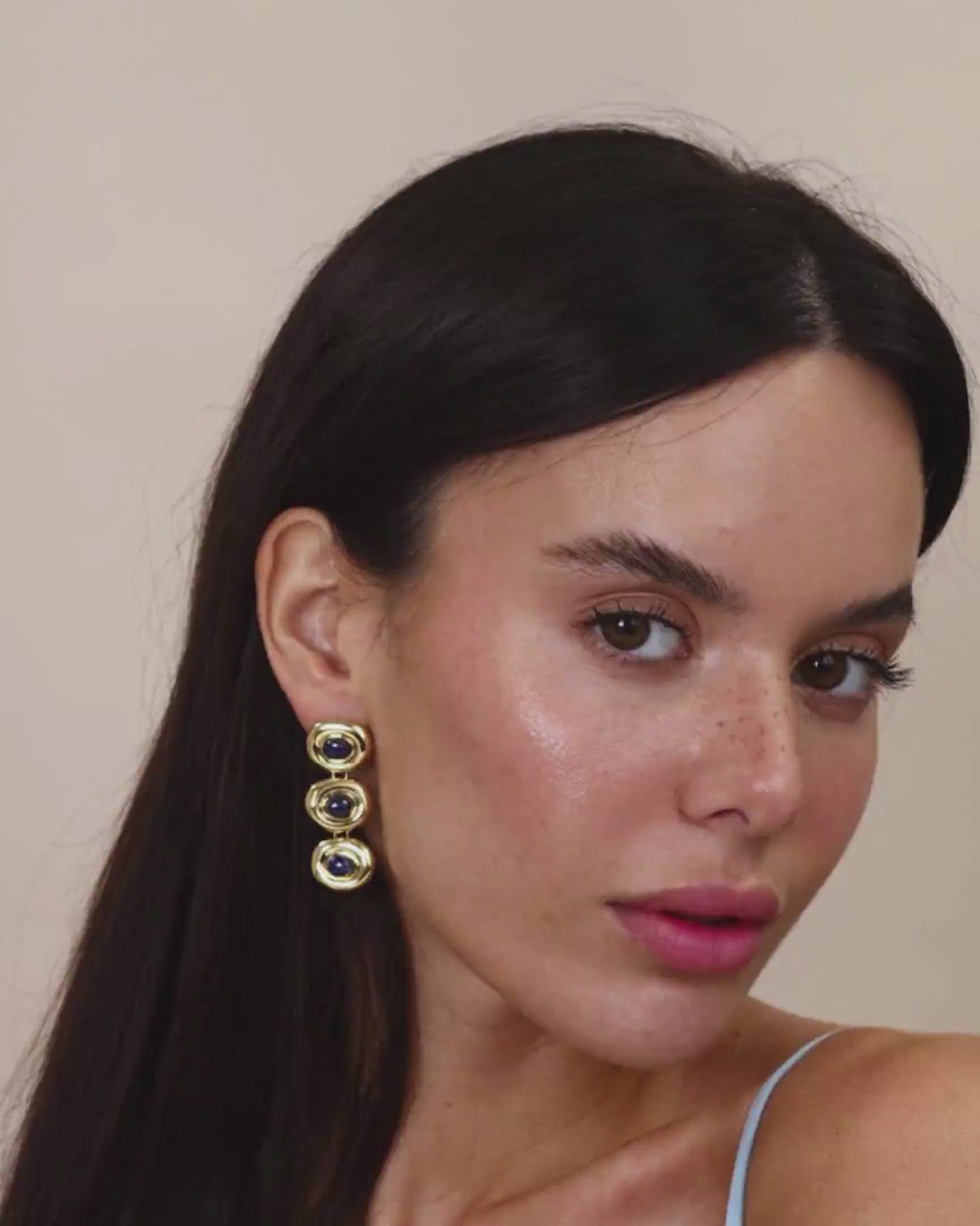 These triple drop earrings feature resin lapis gemstones, symbolizing strength and courage, set in a sculptural design. Let this statement pair dangle solo or style with mini hoops and studs for an instant ear stack.
