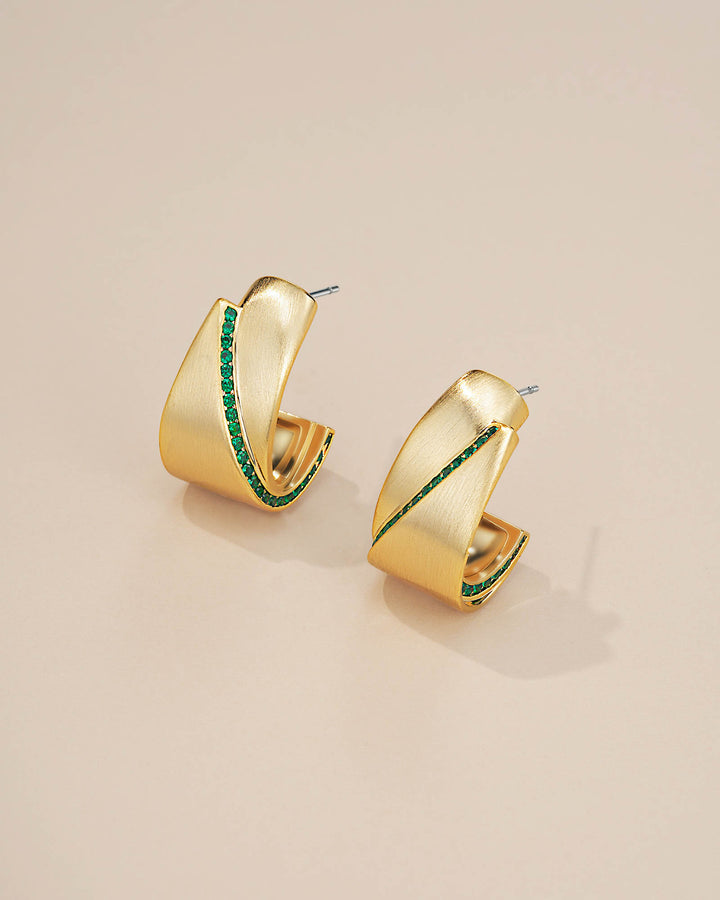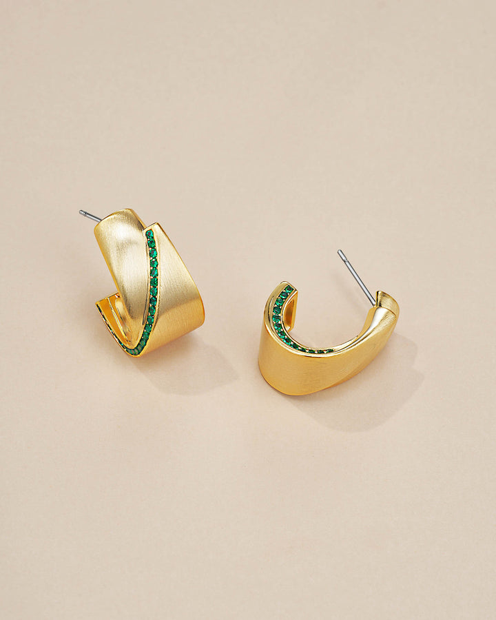 #206-1 Chunky Curve Twisted Open Hoop Statement Stud Earrings with CZ Emerald