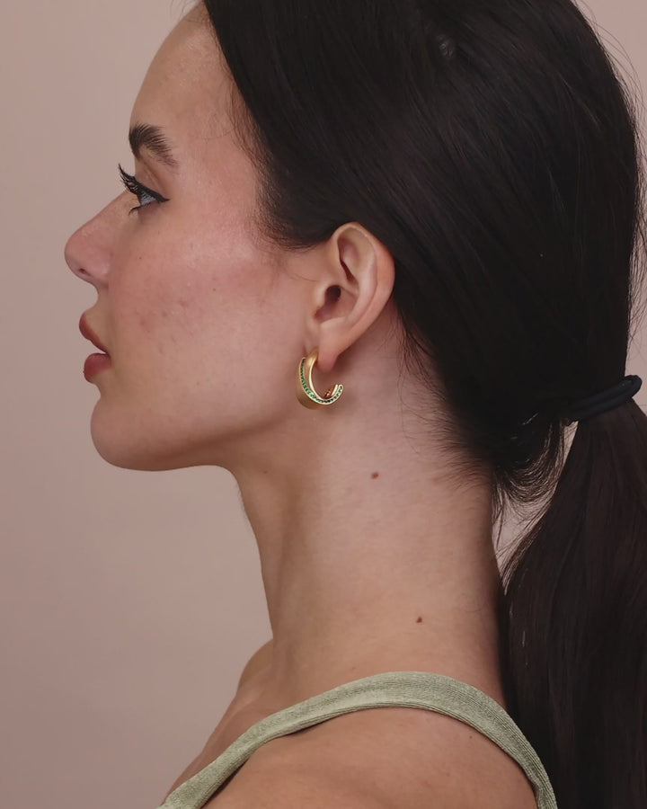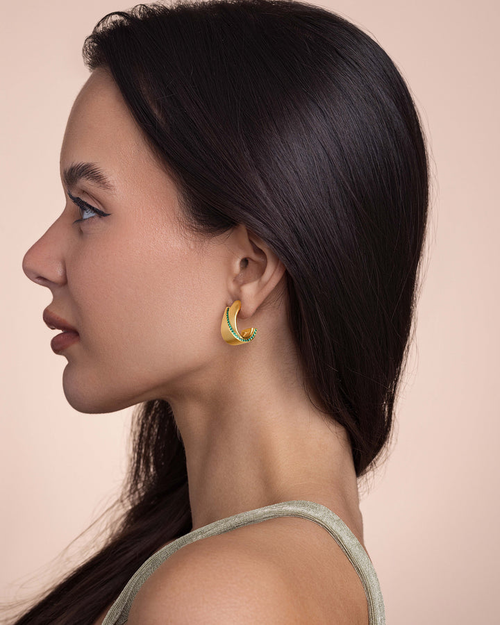 These elegant 18K gold plated bold hardware summer dangly earrings with emerald cubic zirconia are the perfect fit, light yet sturdy feeling. These gorgeous studs are very upscale, detailed to the touch, lightweight and easy to wear. They are made from premium quality material and are 18K gold plated and lightweight to ensure long lasting finish that is nickel/copper/lead free, hypoallergenic, tarnish/rust resistant which is perfect for sensitive skin.