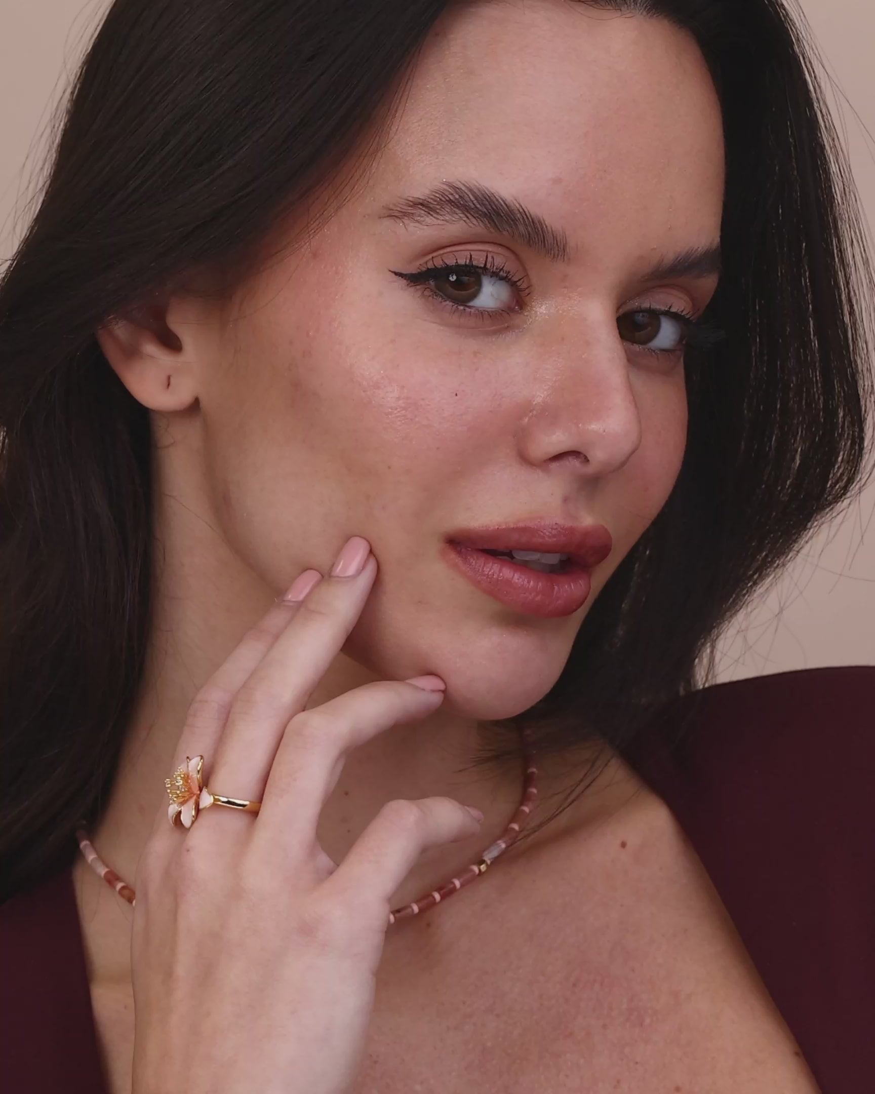 A perfect ring for the nature enthusiast! Light pink enamel floral petal shine in textured with cz for that pop in your outfit