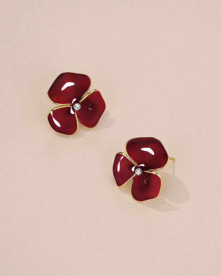 #282 Gold Dainty Burgundy Maroon Enamel Floral Statement Earrings